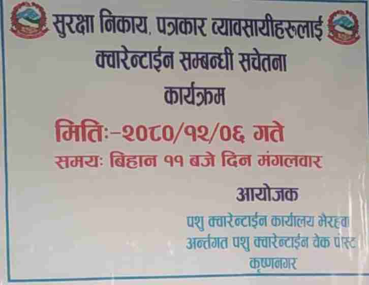 अजय मिश्र, कपिलवस्तु, चैत्र ६ कपिलवस्तु जिल्लाको कृष्णनगरमा आज पशु क्वारेन्टाइन कार्यालय भैरहवा अन्तर्गत पशु क्वारेन्टा...